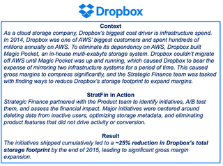 The Dropbox Strategic Finance team played a crucial part in redefining the Finance function for much of Silicon Valley and created a blueprint for how the Finance organization could transcend its traditional responsibilities and exponentially increase its impact. Dropbox’s Strategic Finance team played an important role in taking the company public, raising hundreds of millions of dollars in debt and equity and building Dropbox into a highly profitable company at scale that now controls its own destiny.