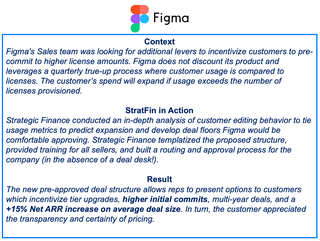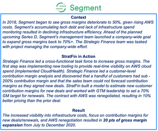 The Strategic Finance leaders at Figma, Grammarly, Segment and Whoop told me about the most impactful projects their teams had worked on, which I’ve summarized in the table below. These projects include cost optimization, pricing/packaging, fundraising and improving GTM efficiency and show the broad range of impact Strategic Finance teams can have.