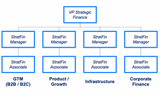 For larger teams that have a more mature Strategic Finance function, the organization would have more hierarchy, represented in the chart below. There will usually be 1-3 StratFin associates reporting to one StratFin manager in larger Finance teams.